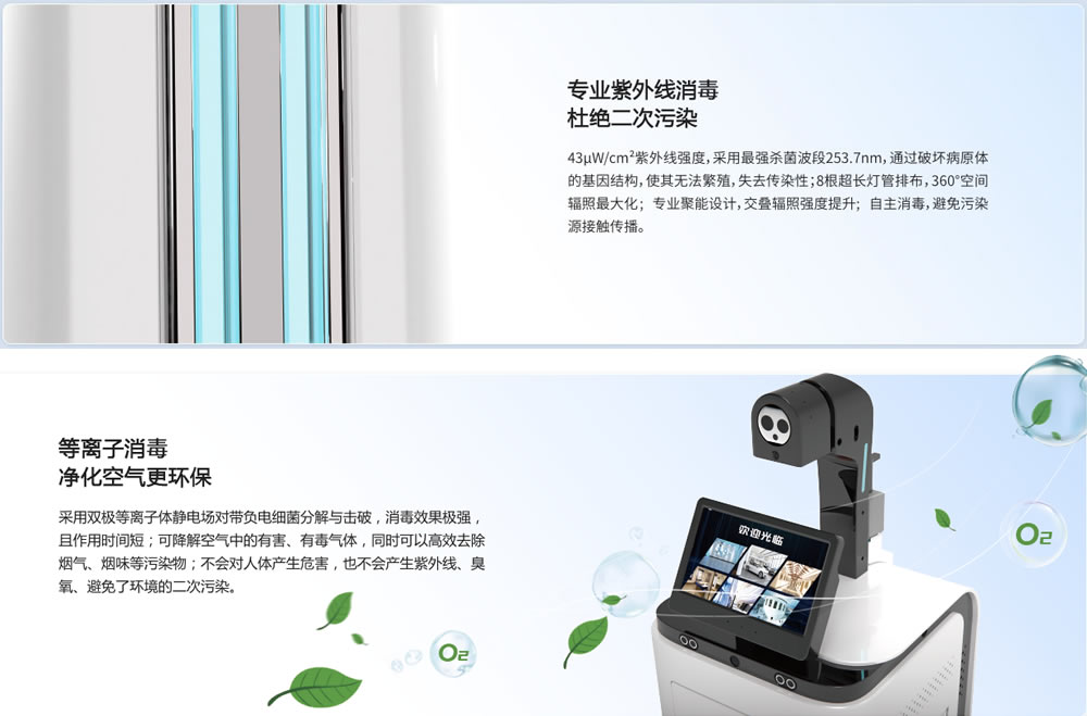 空氣消毒機(jī)器人使用等離子消毒,紫外線消毒,地面消毒和霧化消毒等方式殺滅空氣中的病毒,可以應(yīng)用在房間 大廳等場景