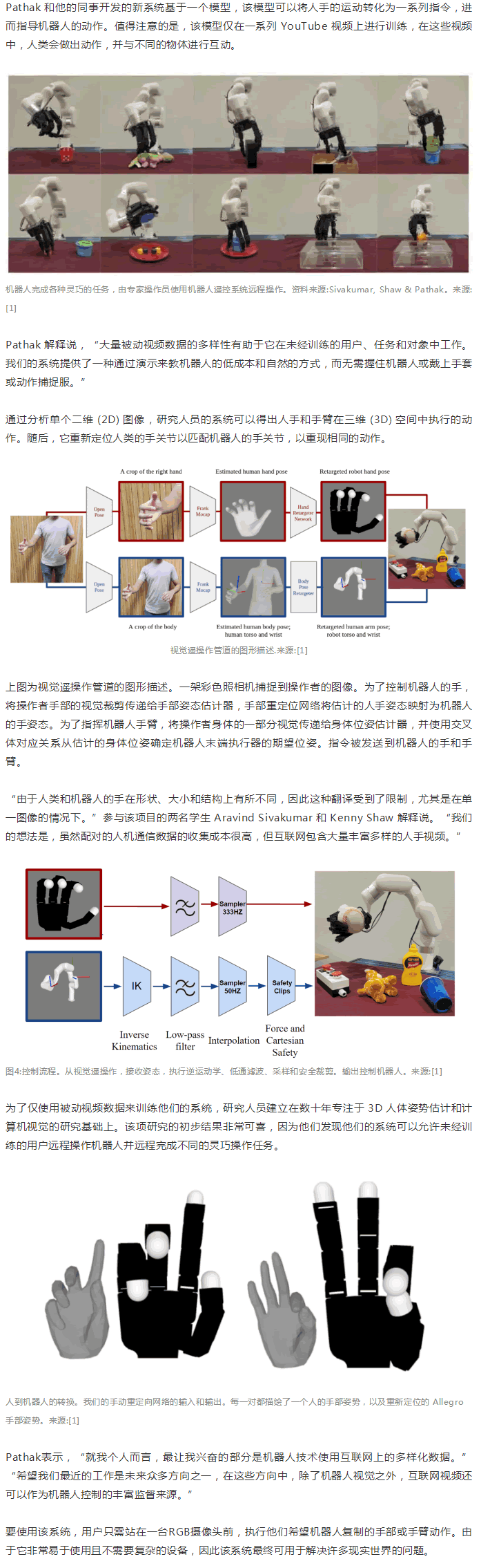 研究人員Deepak Pathak 告訴 TechXplore,“這一L域之前的工作要么依賴手套、運動標記器,要么依賴校準的多攝像機設置。而我們的系統使用一個未校準的攝像機。由于不需要校準,用戶可以站在任何地方,仍然可以成功地遠程操作機器人。”