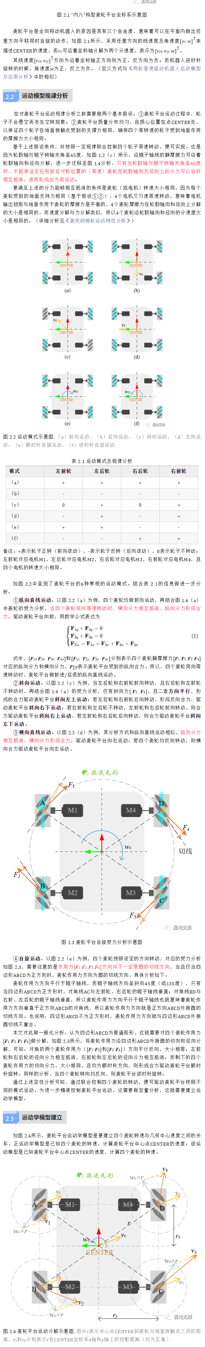 麥克納姆輪平臺因其優異的機動性而備受關注,本文深入分析麥克納姆輪的運動機理及其麥輪平臺運動過程中的受力情況,先后分析麥輪平臺的6種運動模式及其內在運動規律;并采用速度分解的方法,詳細分析了電機轉速-麥輪實際運動速度-麥輪平臺中心點速度之間的關系,給出完整的物理分析及數學推導過程,構建麥輪平臺的運動學模型;后從速度空間、運動效率等方面分析麥輪平臺的適用場景。