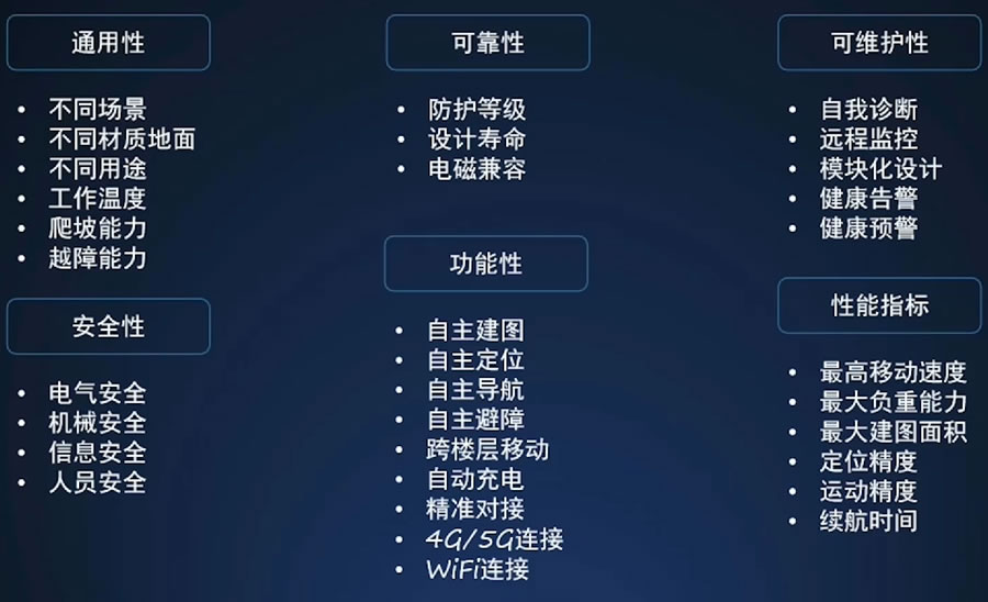 1 通用性:不同場景、不同材質地面、不同用途、工作溫度、爬坡能力、越障能力。