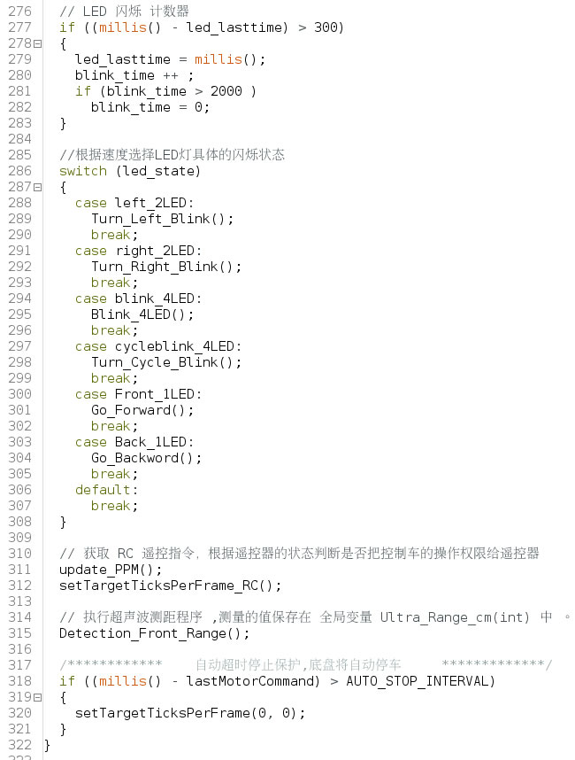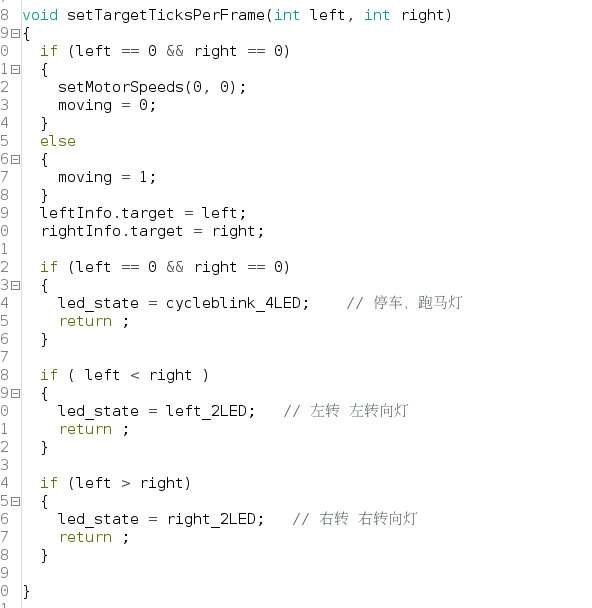 該部分代碼,說明了LED閃爍狀態(tài)的切換方式,其切換的依據(jù)是依靠左右輪執(zhí)行的速度差來決定的。如: