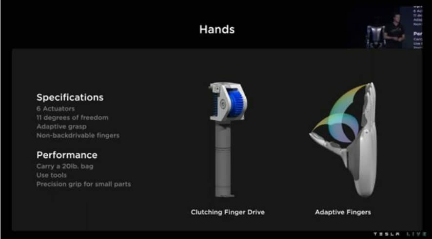“擎天柱”全身約 50 個自由度,手指靈敏度G,能夠滿足多種規(guī)格的物體抓取需求。機(jī)器人單手具有 6 個執(zhí)行器,11 個自由度,在對生拇指與金屬肌腱的配合 下,“擎天柱”能夠完成對不同重量和大小的物件的抓握。同時,特斯拉機(jī)械手搭載能夠驅(qū) 動手指感知物體的傳感器,幫助其識別需要抓握的物體,并在不斷的抓握過程中學(xué)習(xí)提G 機(jī)械手適應(yīng)性。