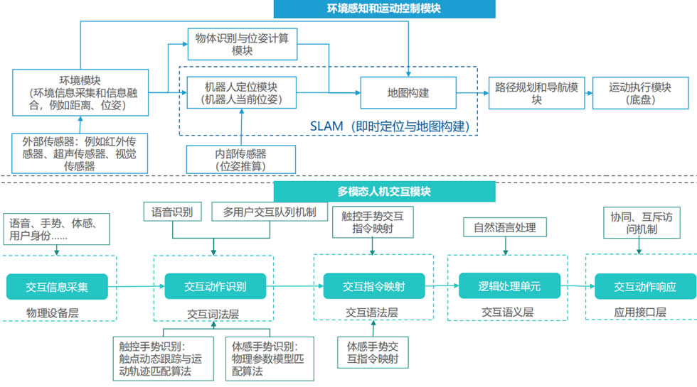 環境感知與導航是指機器人通過傳感器獲取外界環境及自身信息;運動控制器是服務機器人行動的執行者;人機交互技術是實現服務機器 人與人溝通的橋梁