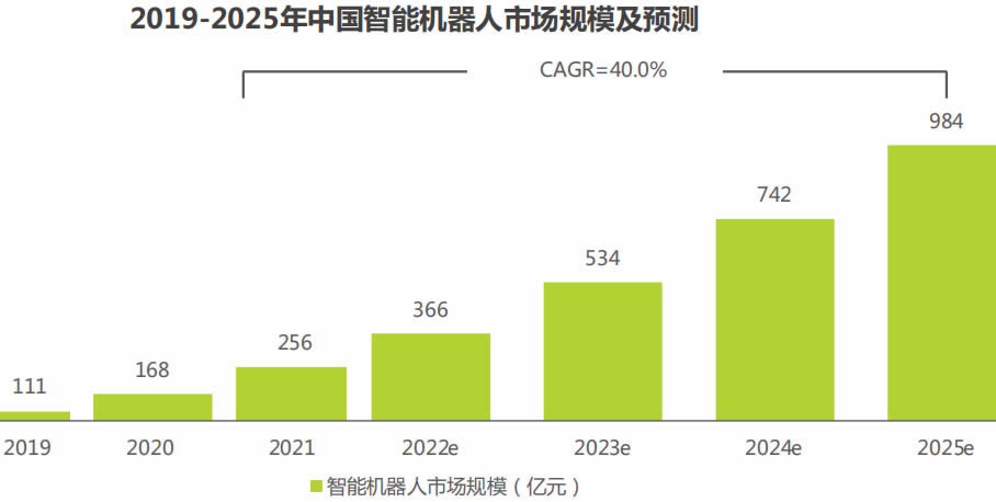 力及勞動(dòng)力的旺盛需求,整個(gè)機(jī)器人產(chǎn)業(yè)呈現(xiàn)健康走勢(shì)。艾瑞預(yù)測(cè),2025年中國(guó)智能機(jī)器人市場(chǎng)規(guī)模接近千億。相較于