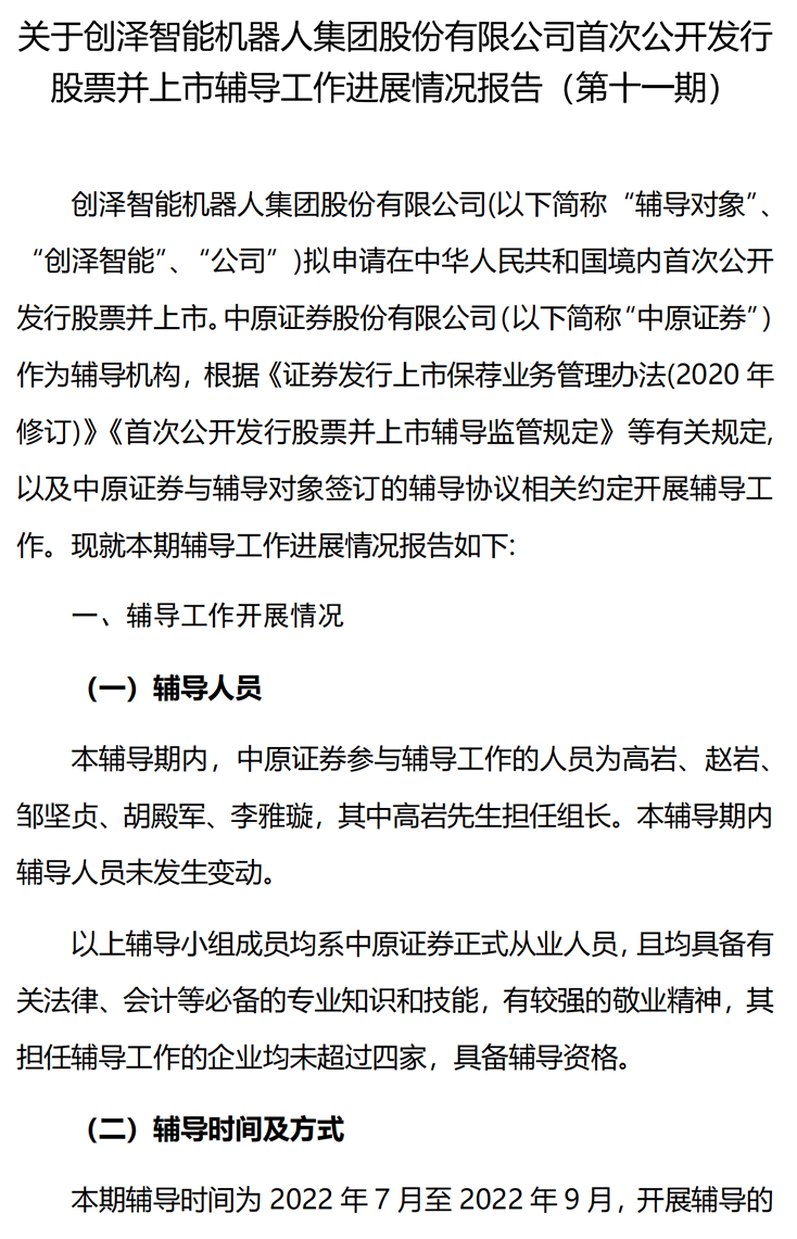 創澤智能機器人集團股份有限公司首次公開發行股票并上市輔導工作進展報告(第十一期)