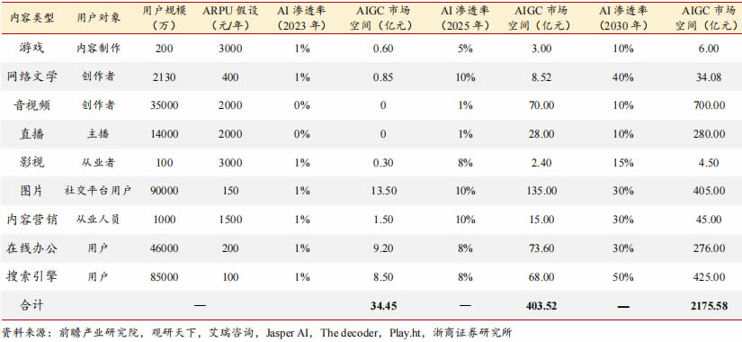 式,測算國內 2023 年、2025 年和 2030 年 AIGC 市場空間。