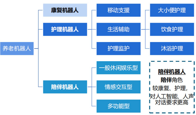 養老助殘機器人是智慧養老的一個分支,根據老年人需求類型可主要分為康復機器人、護理機器人和陪伴機器人,其中后兩種類型被廣泛應用于養老機構和家庭環境中,主要用于輔助老年人日常起居和滿足老年人的心理、娛樂需求。