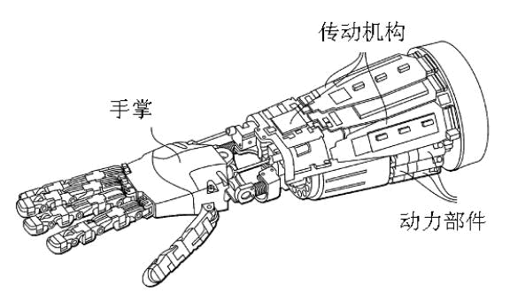DARPA Extrinsic 靈巧手由美國國防部研制,該手具有 5 個手指,其電機和傳動系統 都集成在前臂,被稱為 Cobot。前臂 Cobot 由 1 個 30W 的動力電機和 15 個操縱電機 組成。動力電機是 Cobot 的主驅動元件,沿該電機的輸出軸布置著 5 個圓盤,每個圓 盤內都集成有 3 個 CVT 裝置。CVT 裝置由操縱電機、位置傳感器、動力傳動球、操縱 輥和同步齒輪組成的,能夠根據需要調整轉矩和速度。