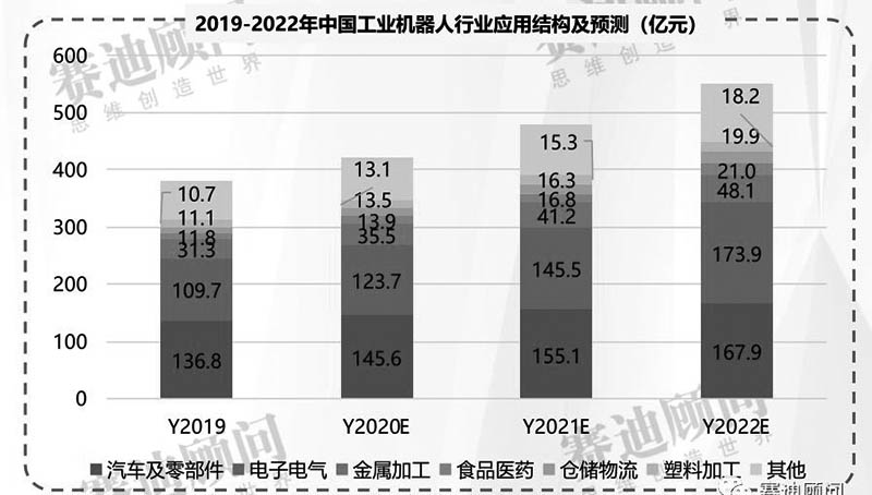 未來三年,工業機器人行業應用結構的總體格局基本保持不變。到2022年,汽車及零部件、電子電氣仍然占據大比重,隨著制造業轉型升級進程的不斷加速,將為金屬加工、食品醫藥、倉儲物流等應用行業帶來更大的市場空間。